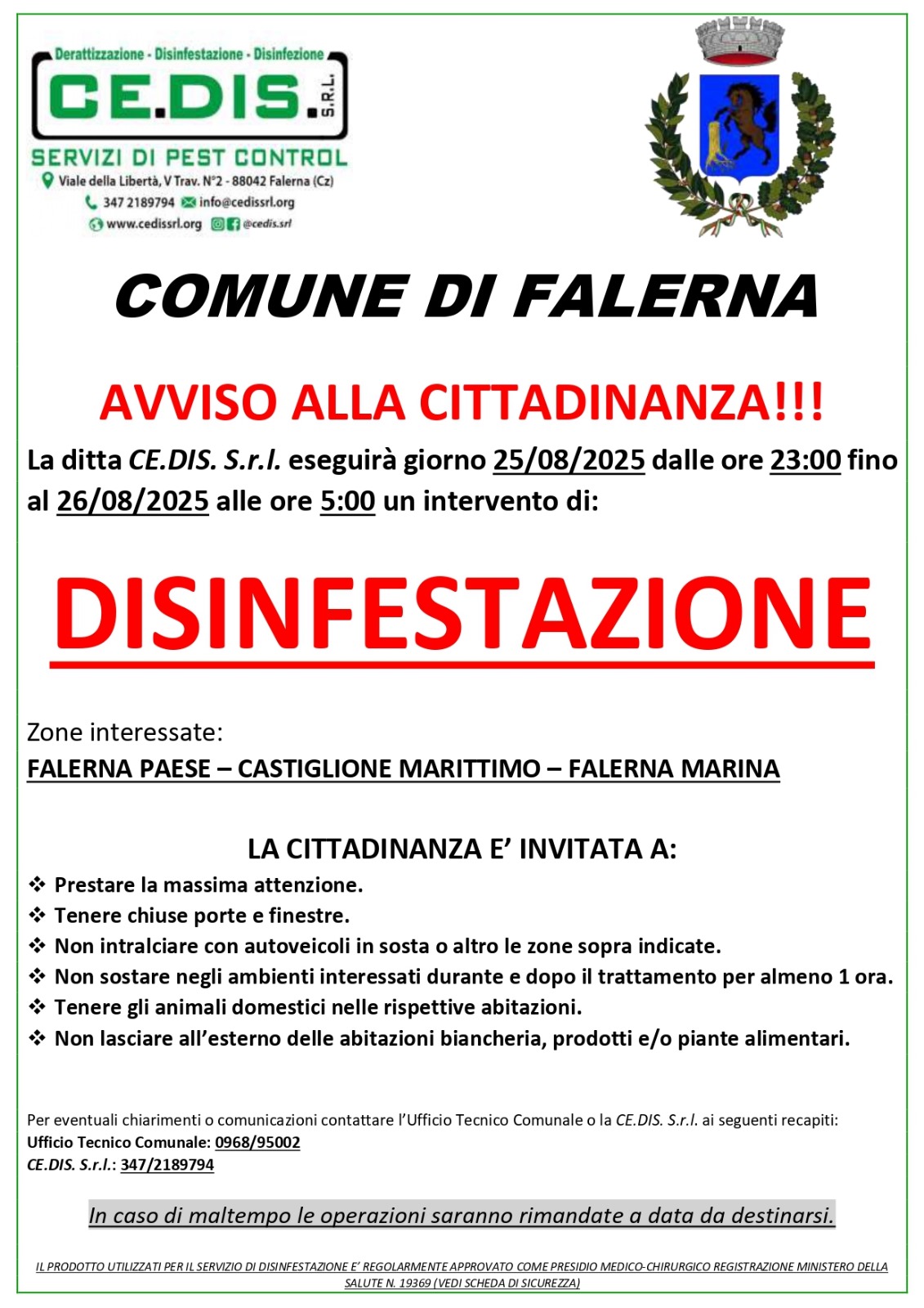 Si avvisa la cittadinanza che Lunedi 25 agosto a partire dalle ore 23.00 sarà effettuato un servizio di disinfestazione adulticida su tutto il territorio comunale.